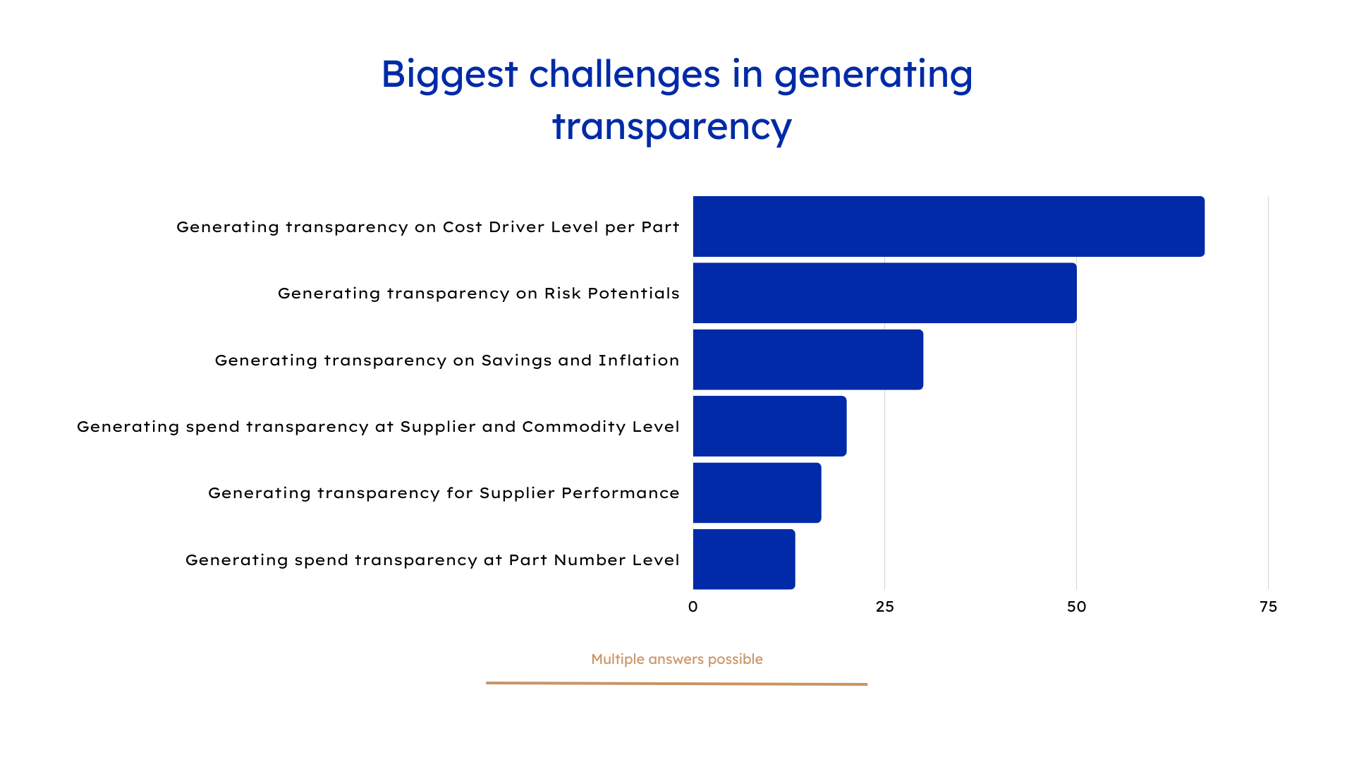 Transparency Transparency is undoubtedly important and it has become clear that companies already have decent visibility and transparency over their spend data on a higher level, e.g. at commodity and/or supplier level. Nevertheless, organizations have big issues getting detailed visibility at a part number and cost driver level and missing an in-depth understanding of their complete commercial potentials and risks.